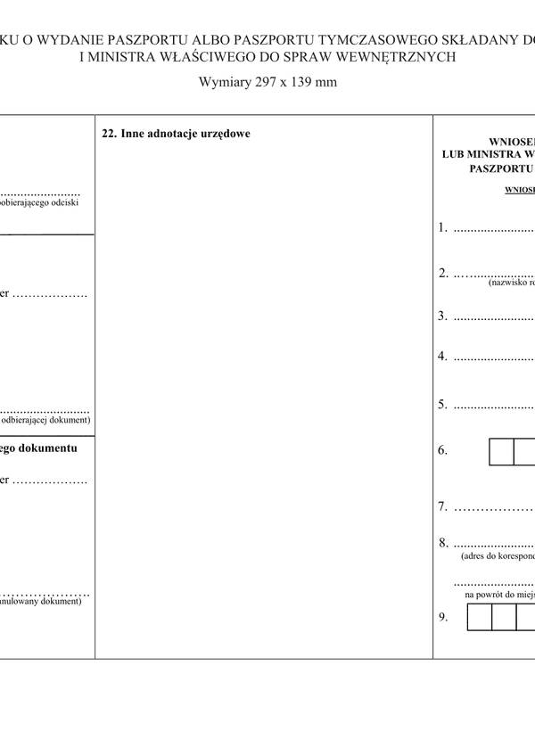 Uwaga! od 13 listopada 2022 roku wniosek o wydanie paszportu składa się do dowolnego wojewody lub konsula w formie dokumentu utrwalonego w postaci elektronicznej - więcej informacji na stronie www.gov.pl Druki wniosków o paszport są przyjmowane tylko wypełnione na oryginalnych